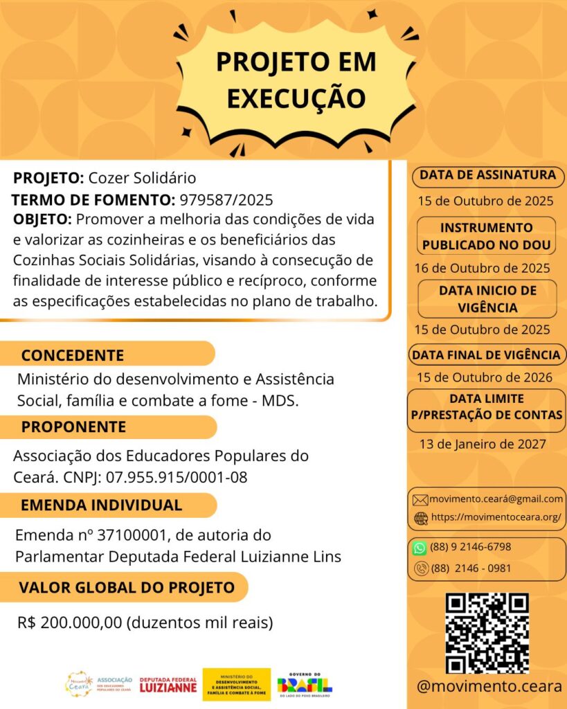 A Associação dos Educadores Populares do Ceará (Movimento Ceará) tem a satisfação de anunciar a execução do projeto Cozer Solidário: Cozinhas que Transformam!