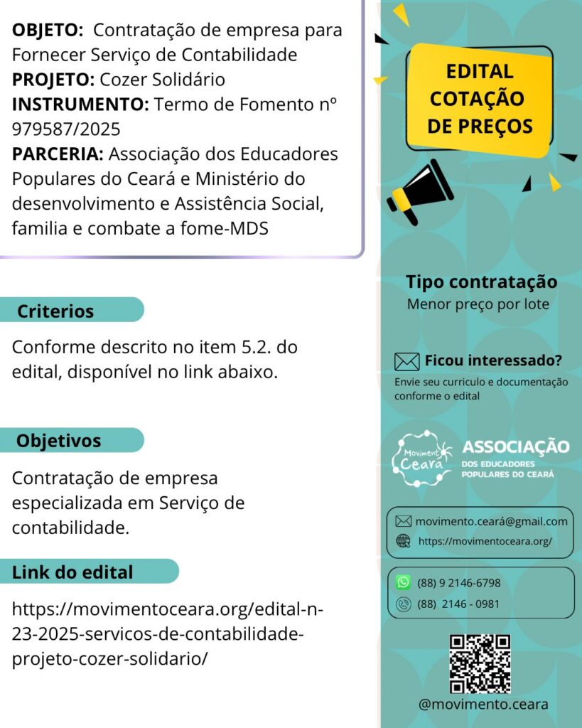 A Associação dos Educadores Populares do Ceará – Movimento Ceará torna público e convida empresas interessadas a participarem da Cotação Prévia de Preços para prestação de serviços de contabilidade no Projeto Cozer Solidário. Projeto executado numa parceria entre a Associação dos Educadores Populares do Ceará e o Ministério do Desenvolvimento e Assistência Social, Família e Combate à Fome (MDS), viabilizado através de Emenda Individual 37100001, de autoria da Parlamentar Luizianne Lins.