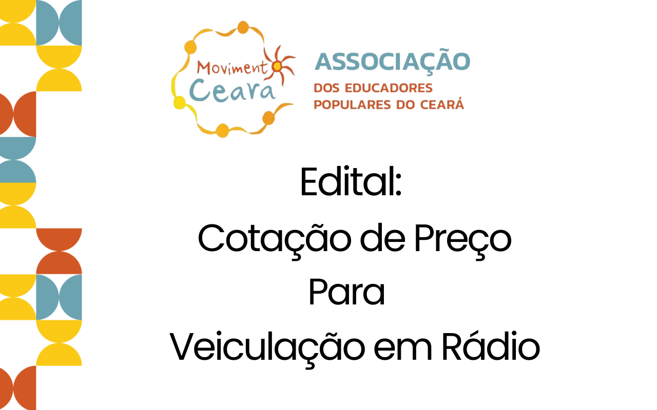 A Associação dos Educadores Populares do Ceará Movimento Ceará torna público o edital de Cotação de Preços para Veiculação em Rádio e convida empresas interessadas a participarem e enviarem proposta de Veiculação em Rádio para uso exclusivo nas atividades do Projeto Elas por Elas. Projeto executado numa parceria entre a Associação dos Educadores Populares do Ceará e o Ministério das Mulheres, viabilizado através de Emenda Individual nº 37100015, de autoria da Parlamentar Luizianne Lins.