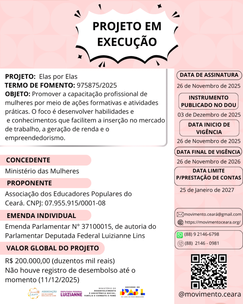 É com grande satisfação que a Associação dos Educadores Populares do Ceará (MOVIMENTO CEARÁ) anuncia o início oficial do Projeto Elas por Elas – Direitos, Vozes e Caminhos para o Futuro! 🤝