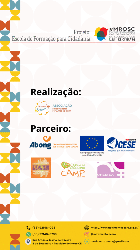 Esta iniciativa conta com o apoio de entidades como Abong, CESE, CAMP, CREMEN e Rede de Educação Cidadã, além de ter o cofinanciamento da União Europeia.